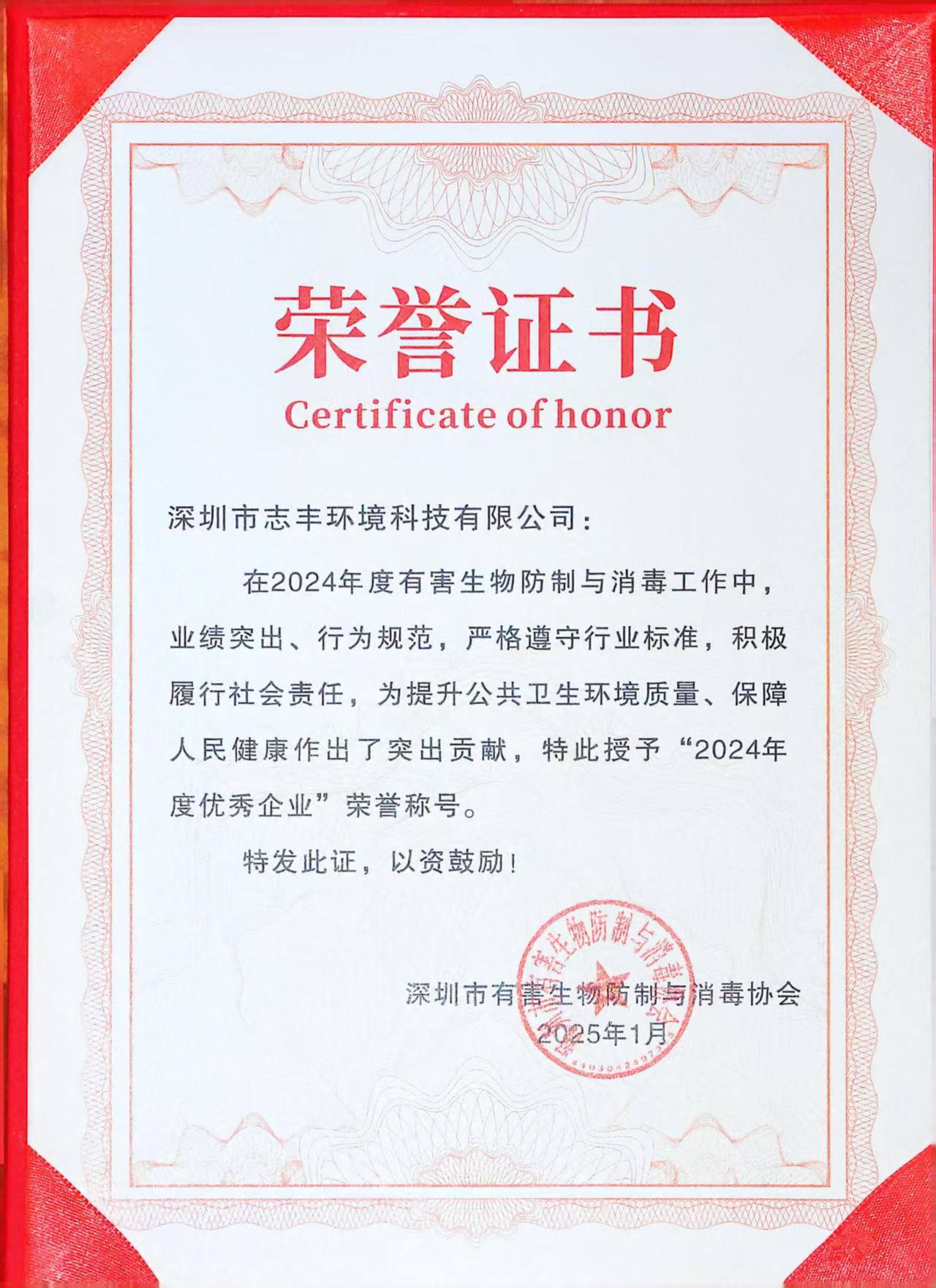 深圳市志丰环境科技有限公司成立于2013年,是经深圳市市场监督管理局注册,深圳市有害生物防治协会审批,广东省病媒生物预防控制有偿服务机构备案,具有广东省室内环境卫生行业协会室内环境污染治理资质等级证书,深圳市病媒生物防治机构服务A级能力证书,深圳市白蚁防治机构服务A级能力证书和深圳市环卫清洁服务资格等级证书,深圳市公共环境消毒清洁服务能力等级证书,深圳市有害生物防治行业先进企业的专业PCO服务公司,是中国有害生物防制协会会员单位,广东省白蚁学会会员单位,广东省环境保护产业协会会员单位,广东省守合同重信用企业,红旗文明诚信企业,宝安诚信商家,并通过ISO9001质量管理体系、ISO45001职业健康安全管理体系、ISO14001环境管理体系认证。